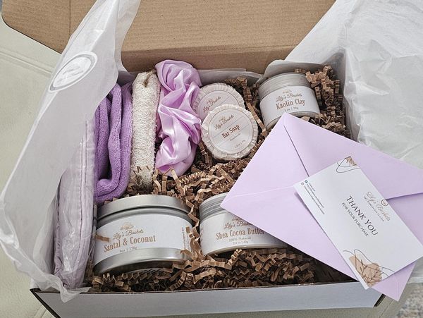 Indulge in a luxurious spa experience from the comfort of your own home with our Spa gift boxes. This Bath and Body Gift Set includes handmade candles, whipped body butter, and shea butter soaps, a scrunchy, a pair of socks, and kaolin clay. Ideal for birthday gifts and more. Send gifts today!